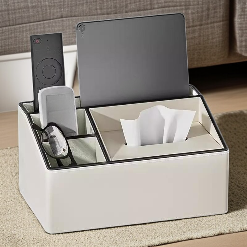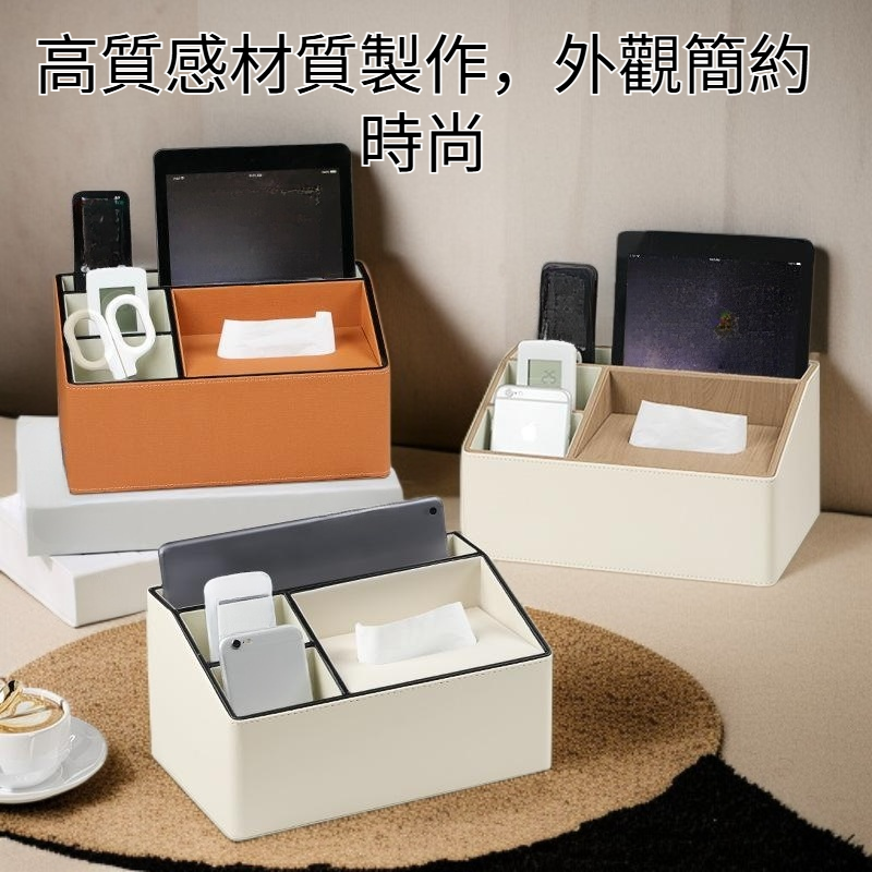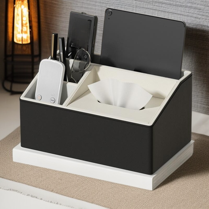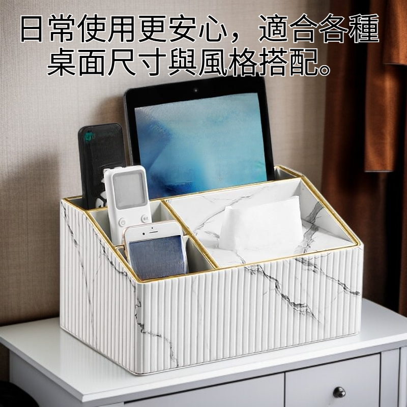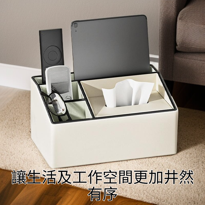 ● 多功能設計,集抽紙盒、遙控器及辦公文具收納於一身,輕鬆打造整潔有序的客廳與辦公空間。
